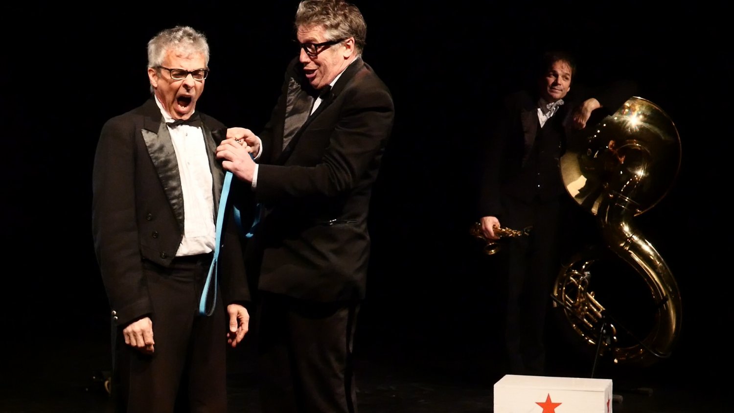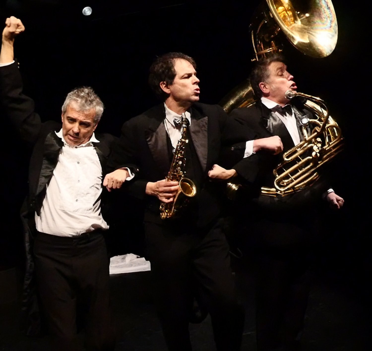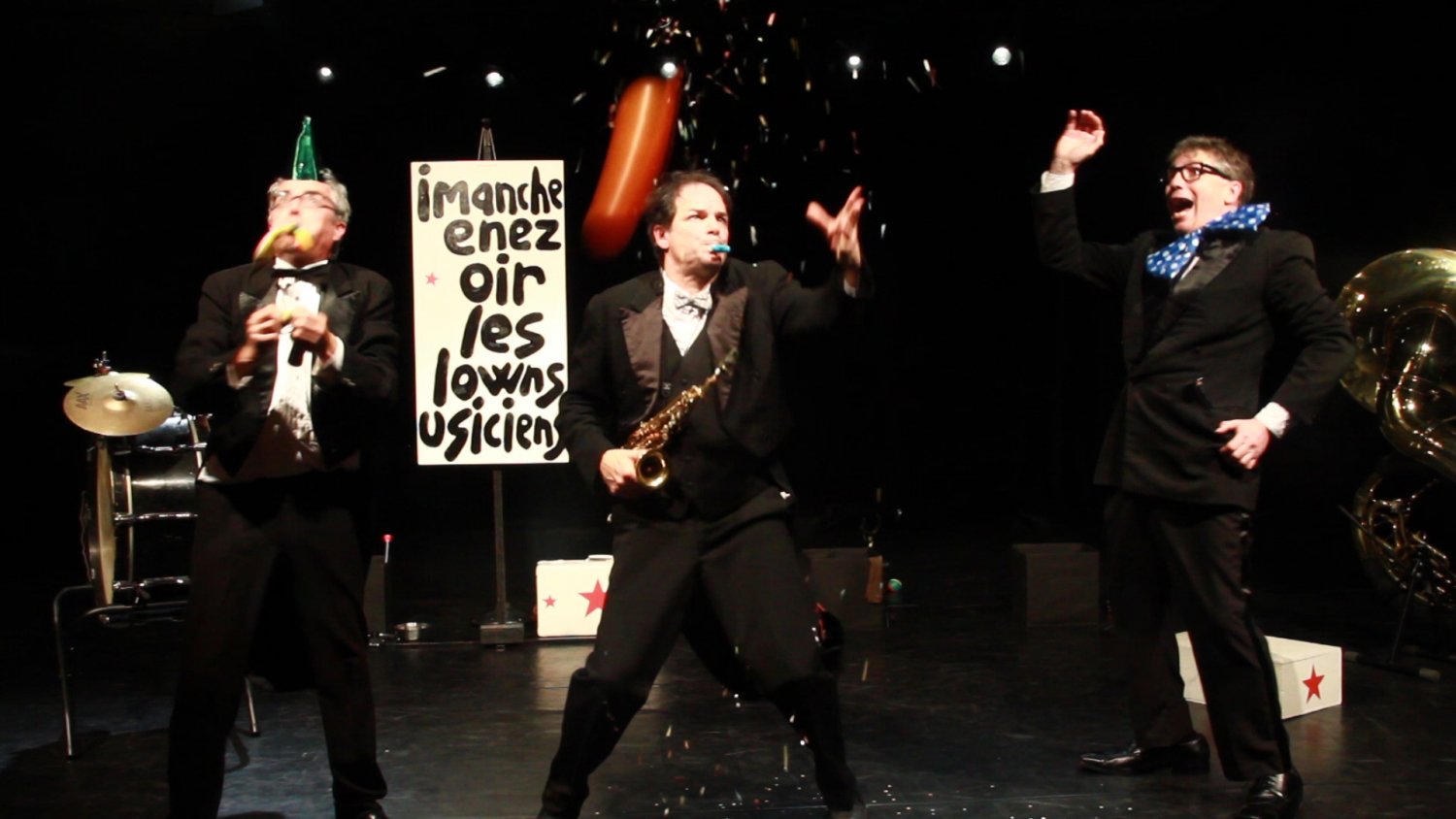 C’est comme si c’était trois clowns échappés d’une roulotte de cirque, d’une boite noire de cinéma, d’une loge de dessous le plancher de la scène ; trois clown-musiciens, des musi-chiens frétillants, naïfs, heureux, sans muselière, des rigolos courants. Et la foule se met à chanter : «Les clowns sont là, lala lala la»